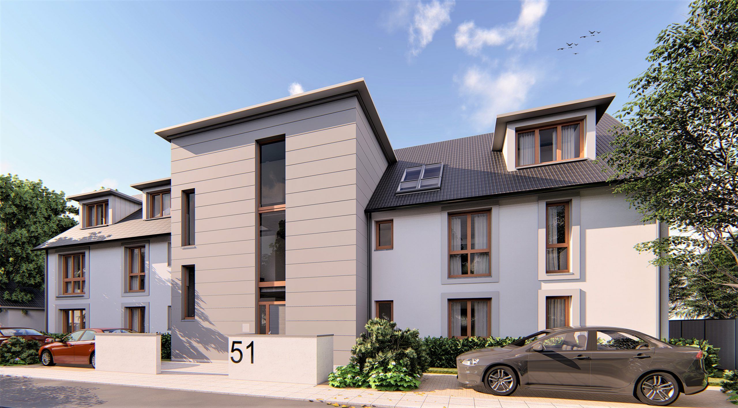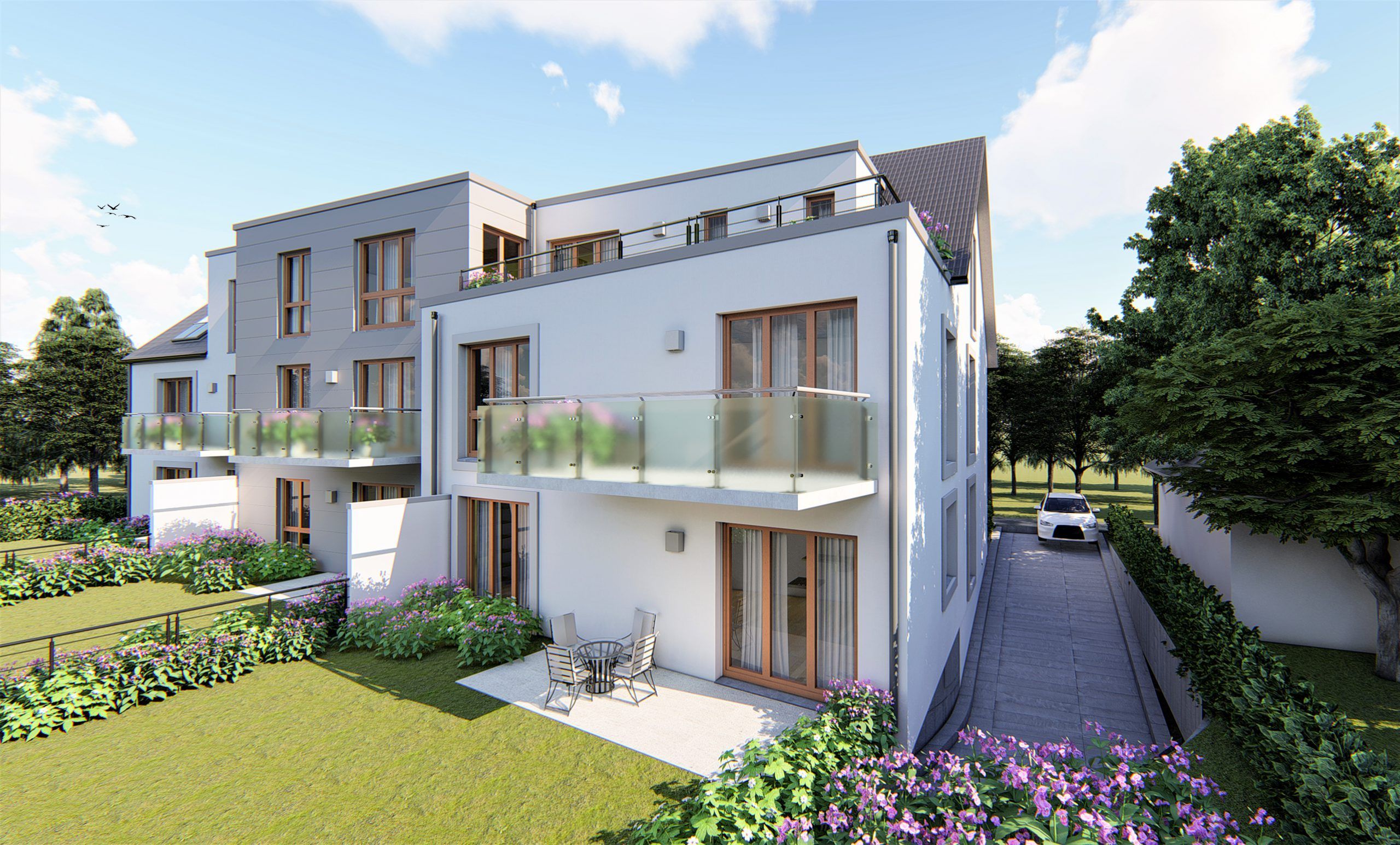 • Neubau eines Mehrfamilienhauses mit 7 Wohneinheiten, Staffelgeschoss mit Satteldach, Aufzug, Tiefgarage